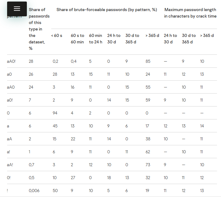 卡巴斯基拿来研究的是已在各种暗网网站上公开泄露的1.93亿个密码。他们大致计算了使用暴力破解以及各种高级算法(如字典攻击、常见字符组合的枚举等)猜测哈希密码所需的时间。
